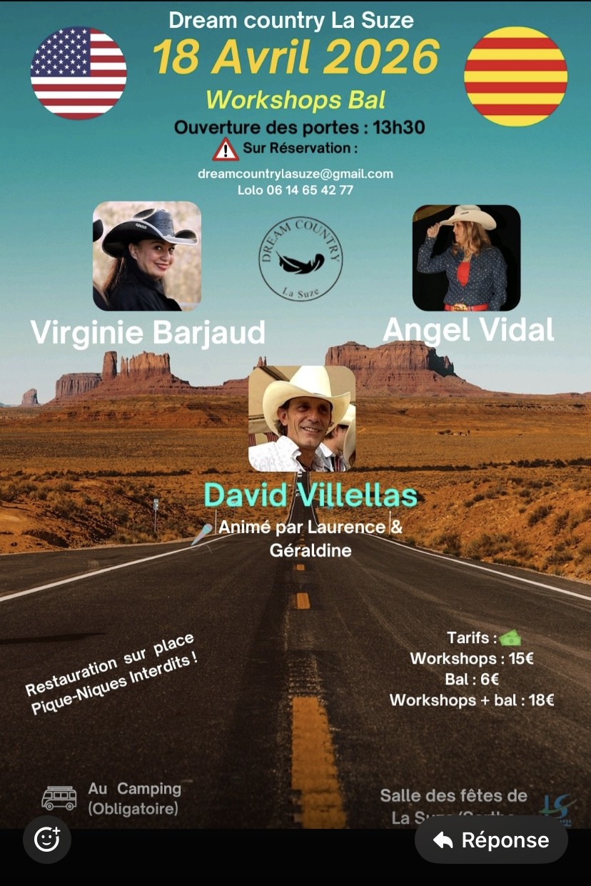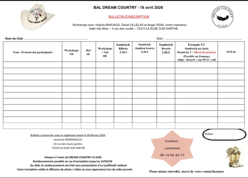 Samedi 18 à 14h : Workshop et Bal CD organisé par Dream Country à La Suze (72) – Affiche – Bulletin de réservation –