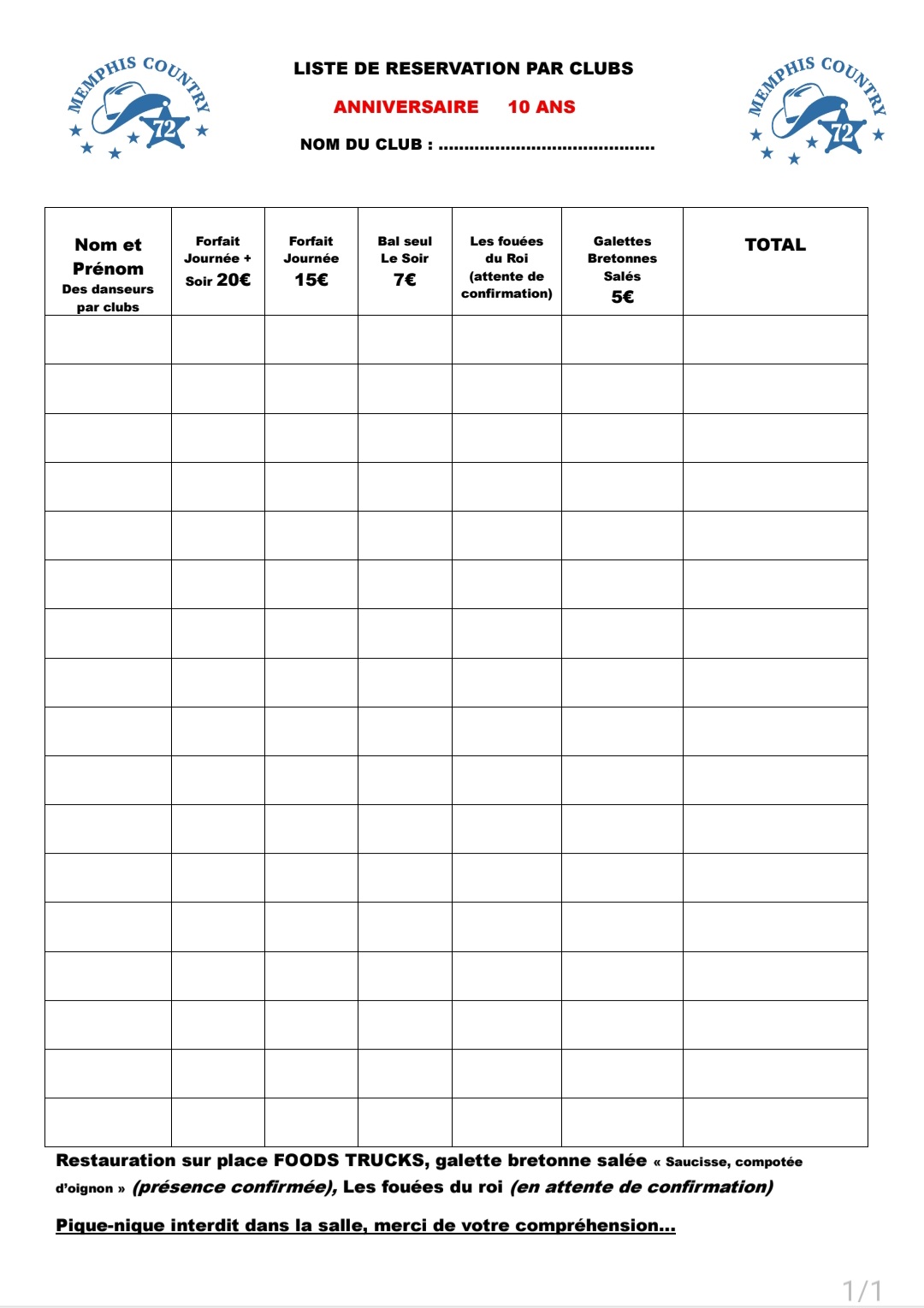 Samedi 9 à 14h : Workshop et Bal organisé par Memphis Country 72 à Connerré (72) pour les 10 ans du club – Affiche – Bulletin de réservation –