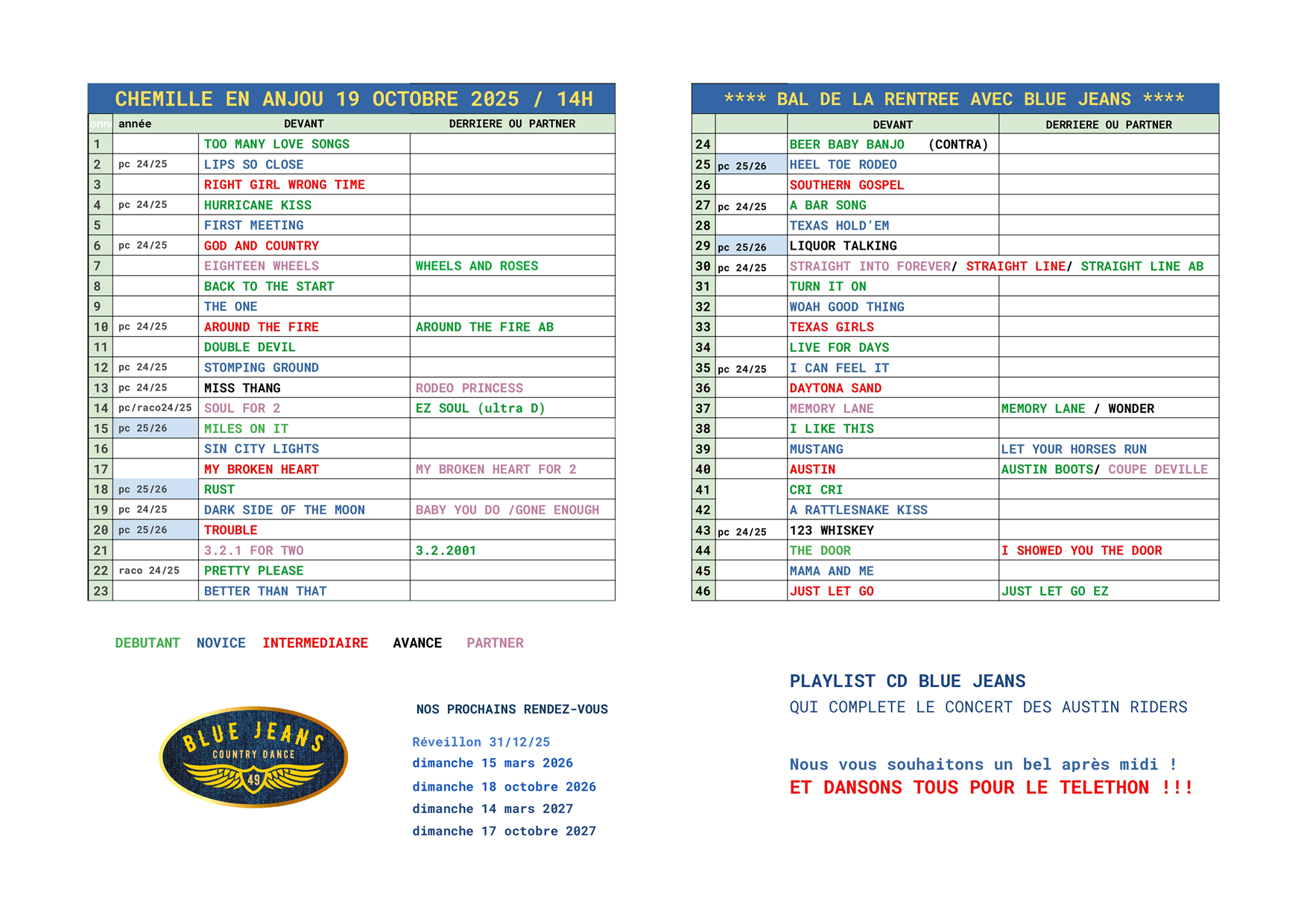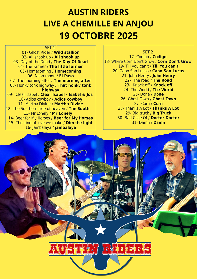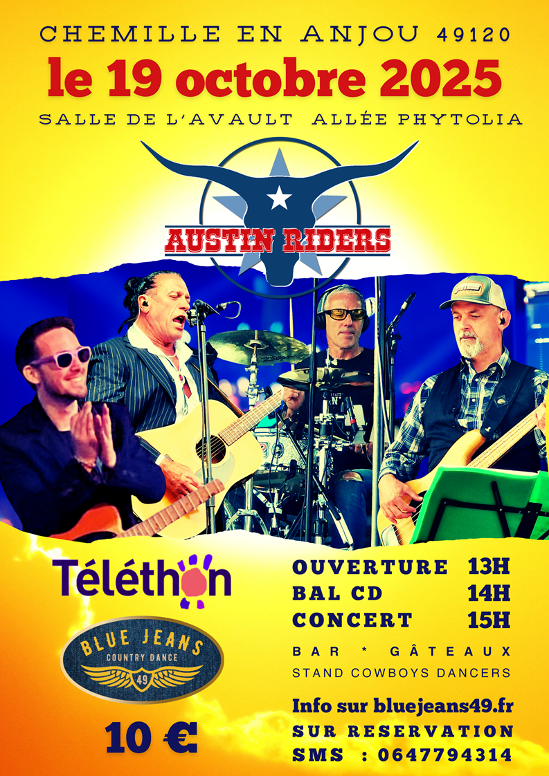Dimanche 19 à 14h : Bal CD et concert des Austin Riders organisé par Blue Jeans Country Dance à Chemillé en Anjou (49) – Affiche – Playlist Austin Riders – Playlist CD –