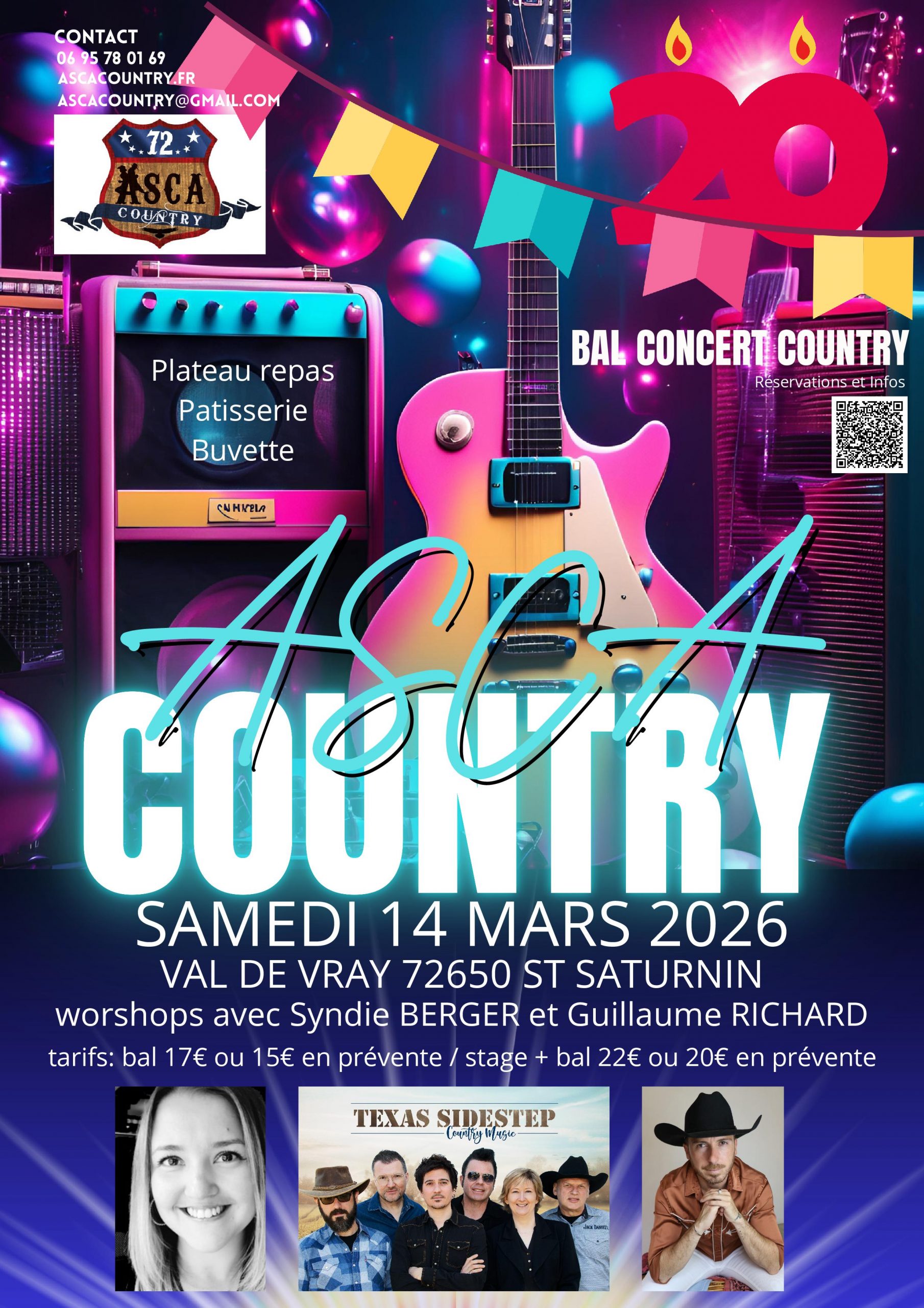 Samedi 14 à 14h : Bal orchestre pour les 20 ans du club de l’ASCA à La Chapelle Saint Aubin (72) – Affiche – Réservation via Hello Asso à partir du site ascacountry.fr, onglet Sorties, bouton Participer –