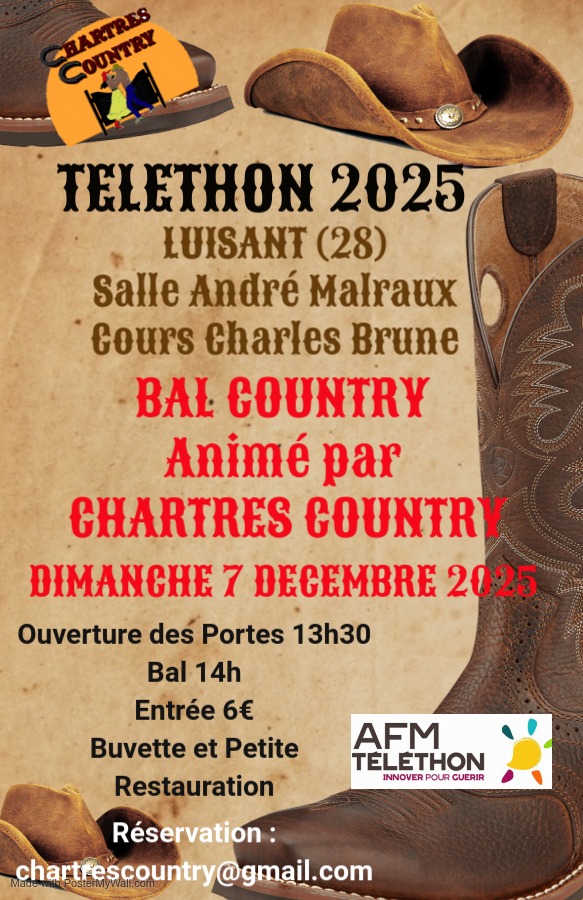 Dimanche 7 à 14h : Bal CD au profit du Téléthon organisé par Chartres Country à Luisant (28) – Affiche –