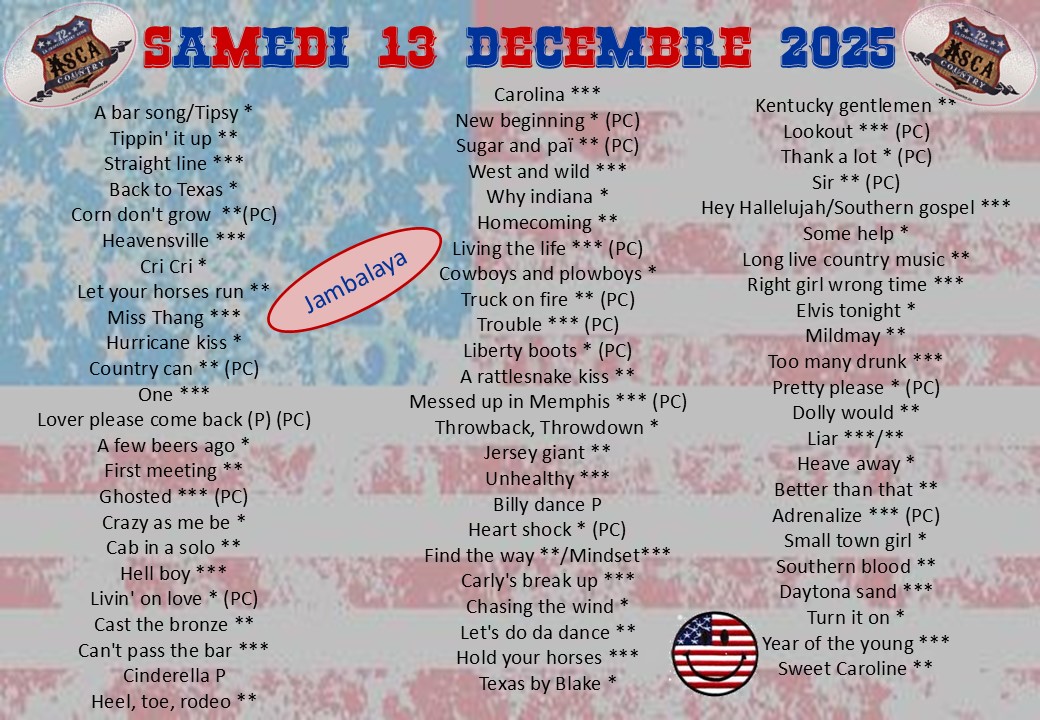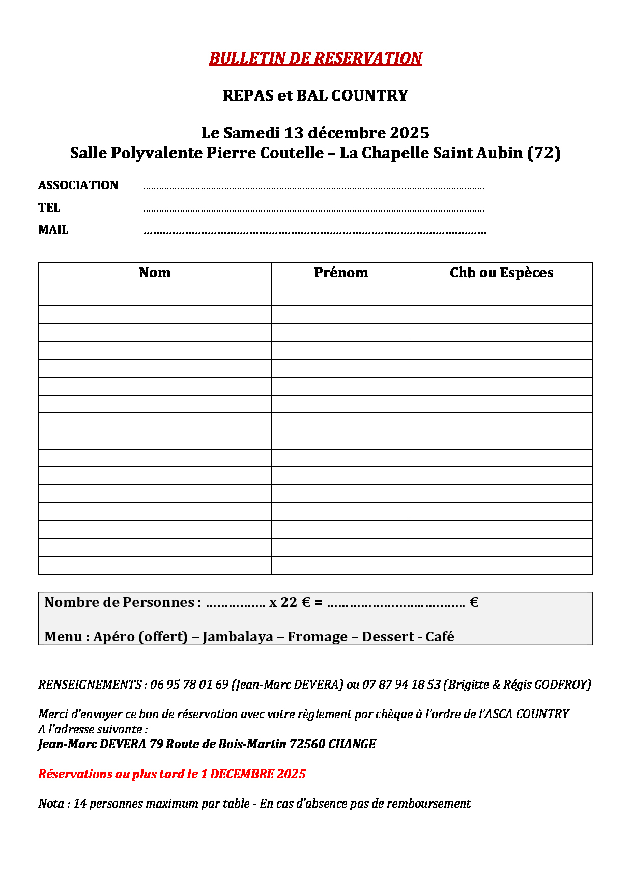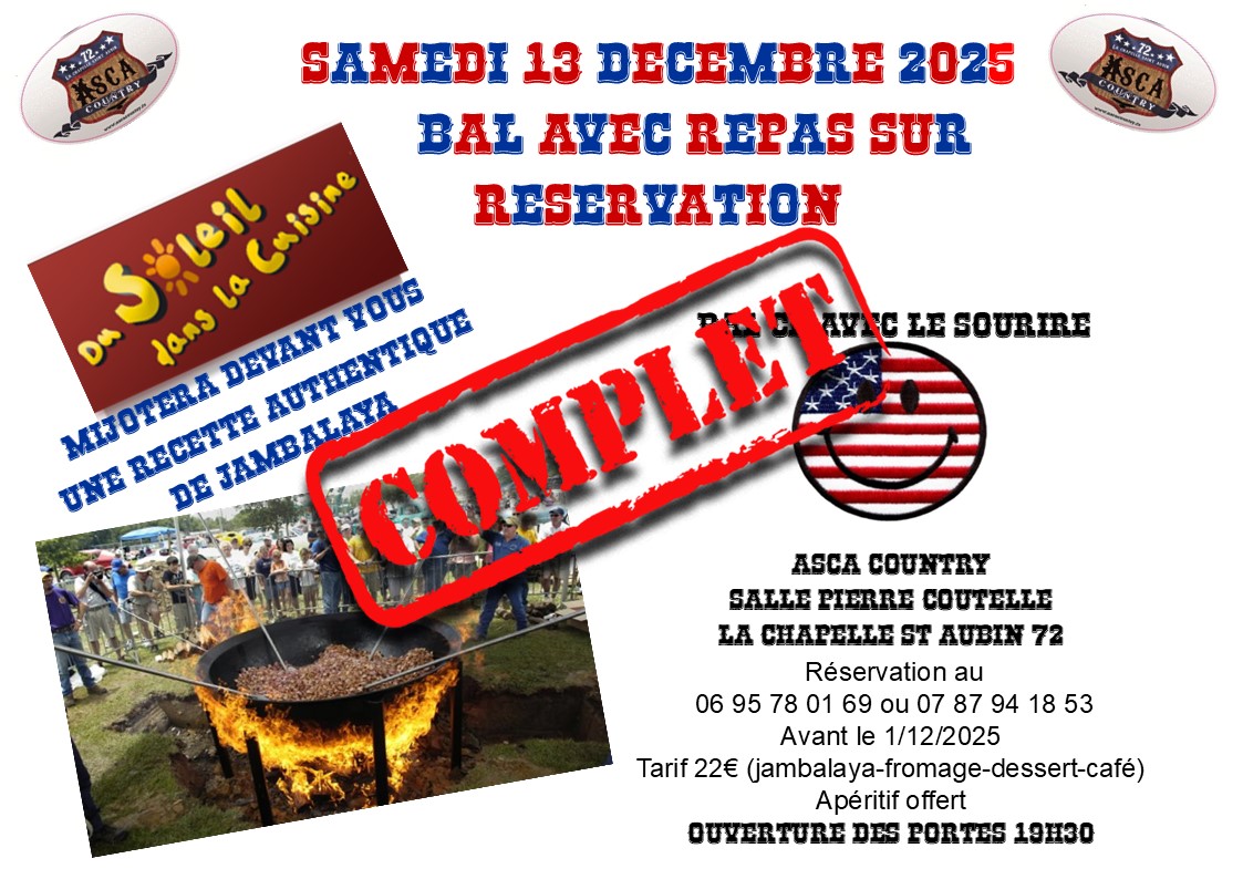 Samedi 13 à 19h : Bal + Repas Jambalaya organisé par Asca Country à la Chapelle Saint Aubin (72) – Affiche – Bulletin de réservation – Playlist – COMPLET –