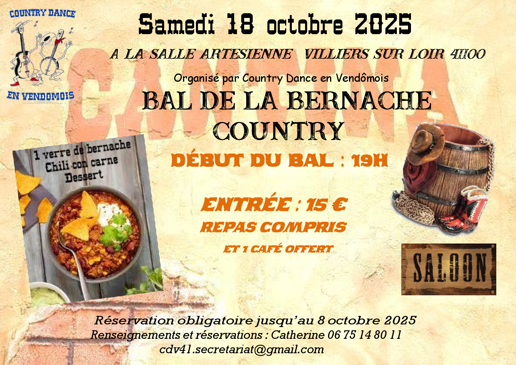 Samedi 18 à 19h : Bal CD de la Bernache organisé par Country Dance en Vendomois à Villiers sur Loir (41) – Affiche – Bulletin de réservation – Playlist –