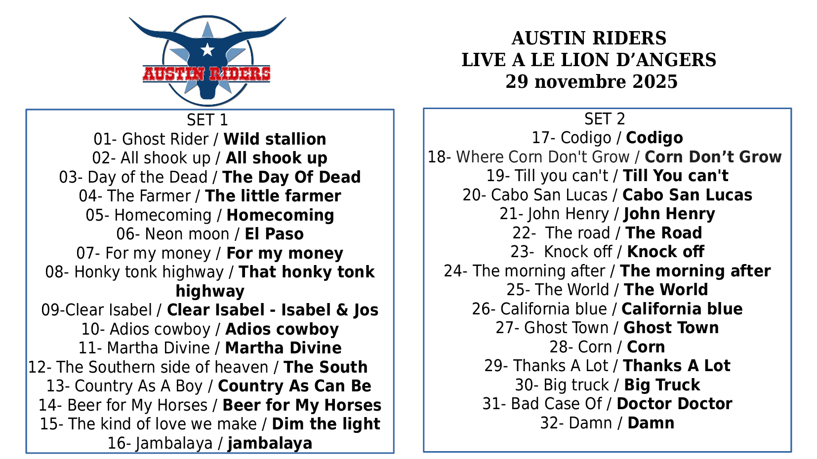 Samedi 29 à 20h : Bal CD et Bal Concert Austin Riders organisé par Madison Country Briollay au Lion d’Angers (49) – Affiche – Playlist CD – Playlist Austin Riders –