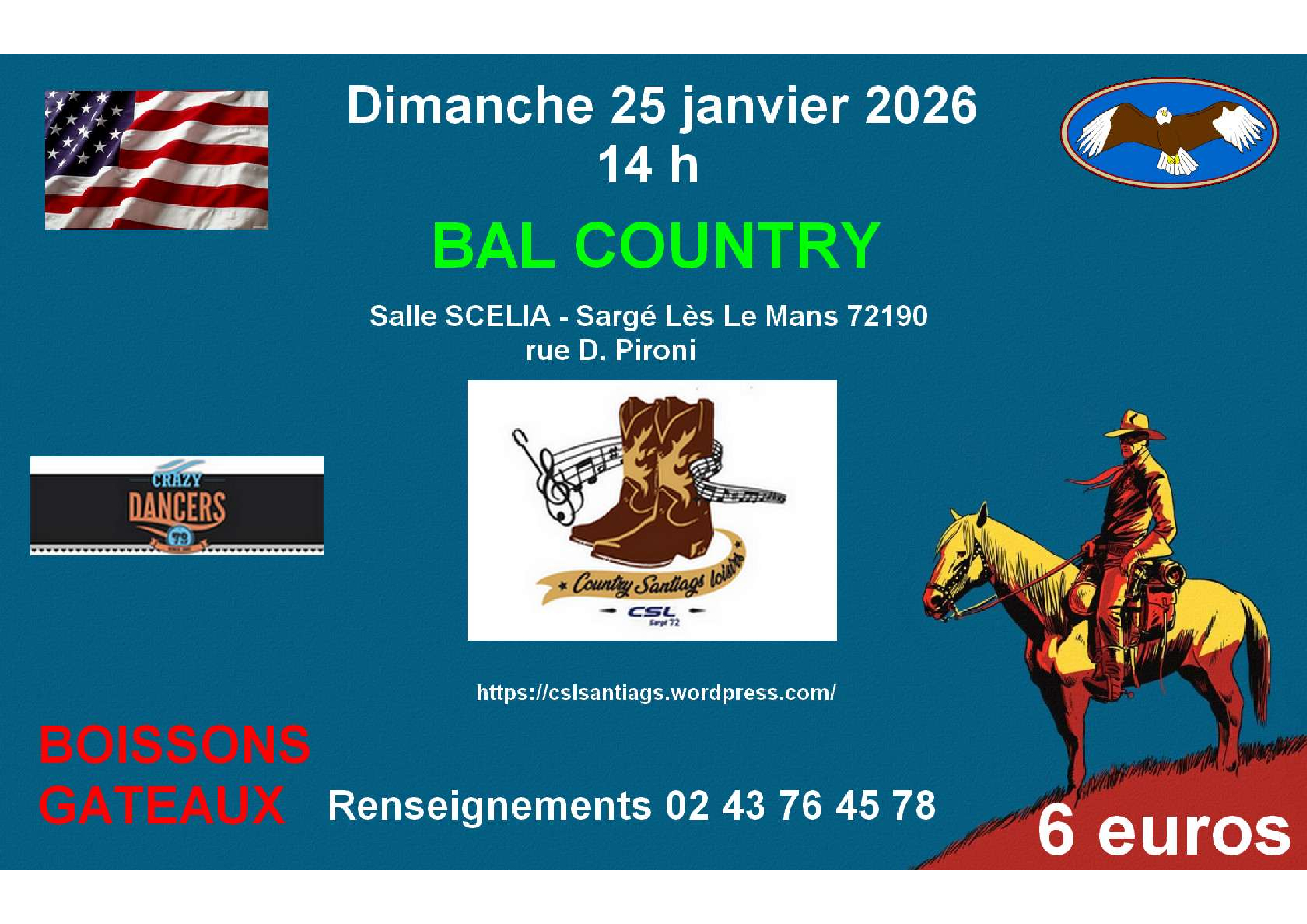 Mercredi 11 à 14h : Bal CD organisé par Country Anim à Parigné L’Evêque (72) –