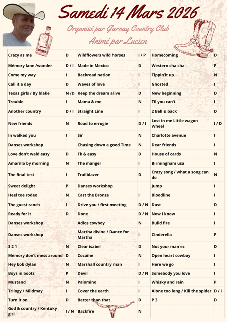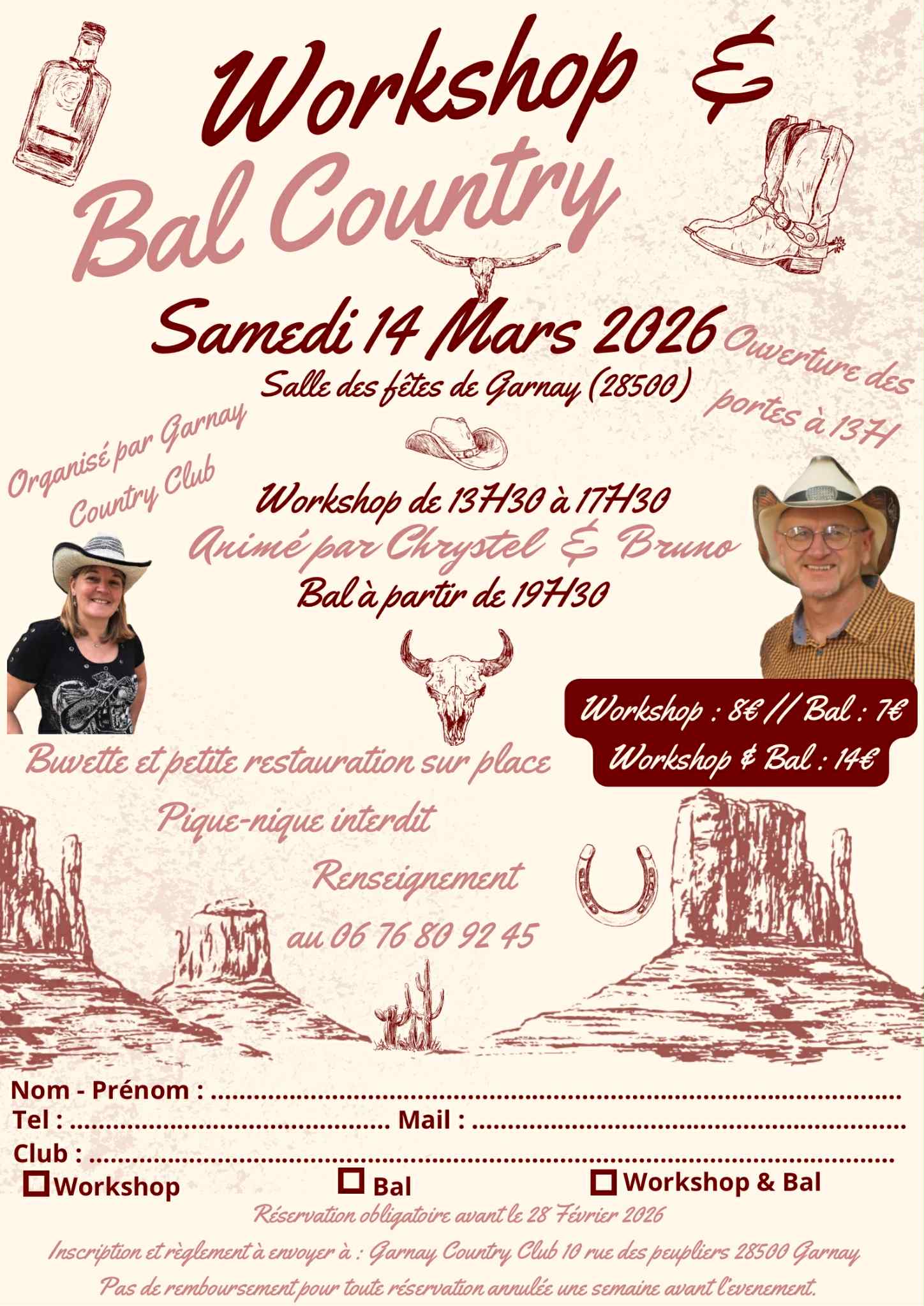 Samedi 14 à 13h30 : Workshop et 19h30 Bal CD organisé par Garnay Country Club à Garnay (28) – Affiche – Playlist Bal – Playlist Après Midi –