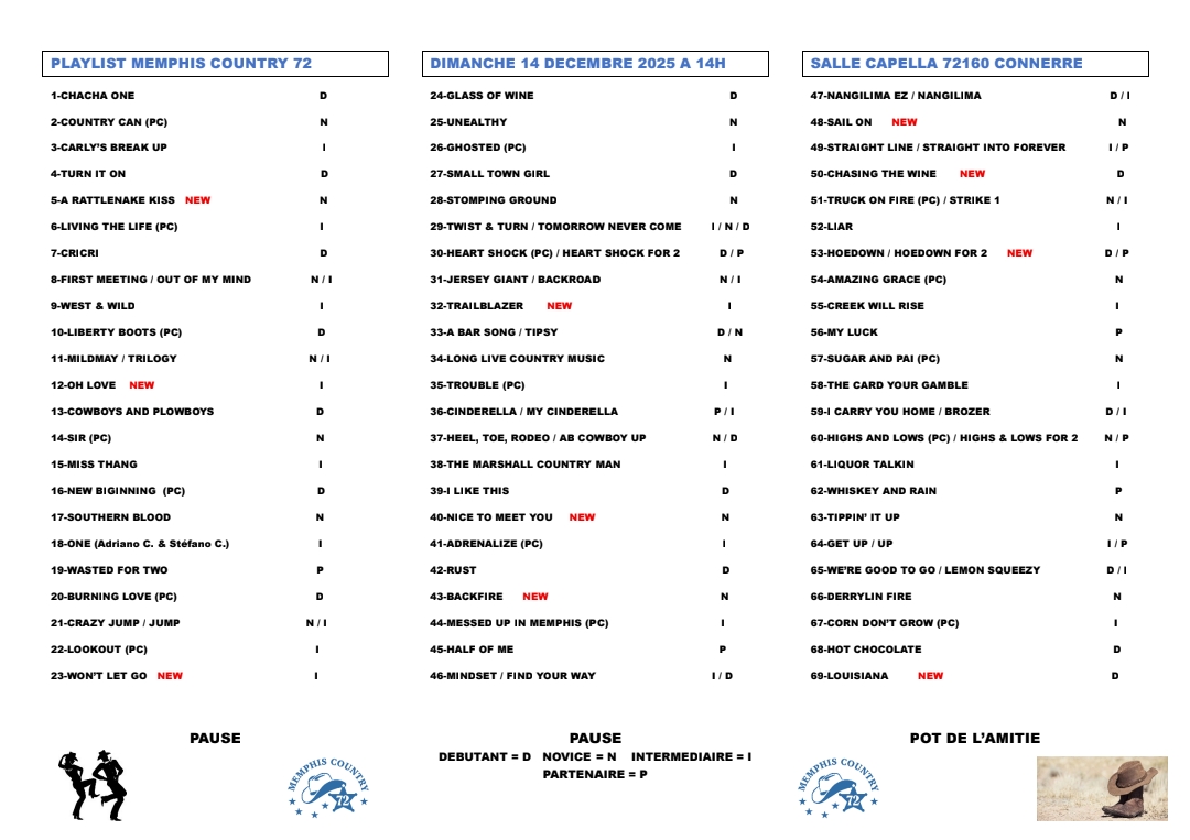 Dimanche 14 à 14h : Bal CD organisé par Memphis Country 72 à Connerré (72) – Affiche – Playlist –