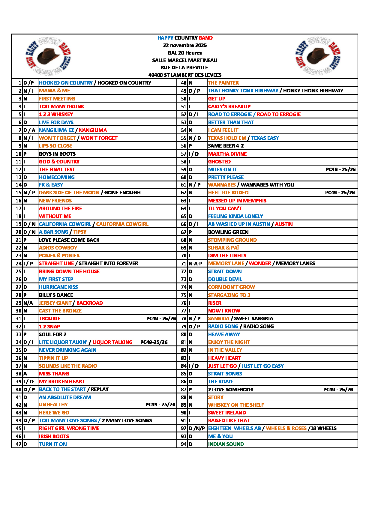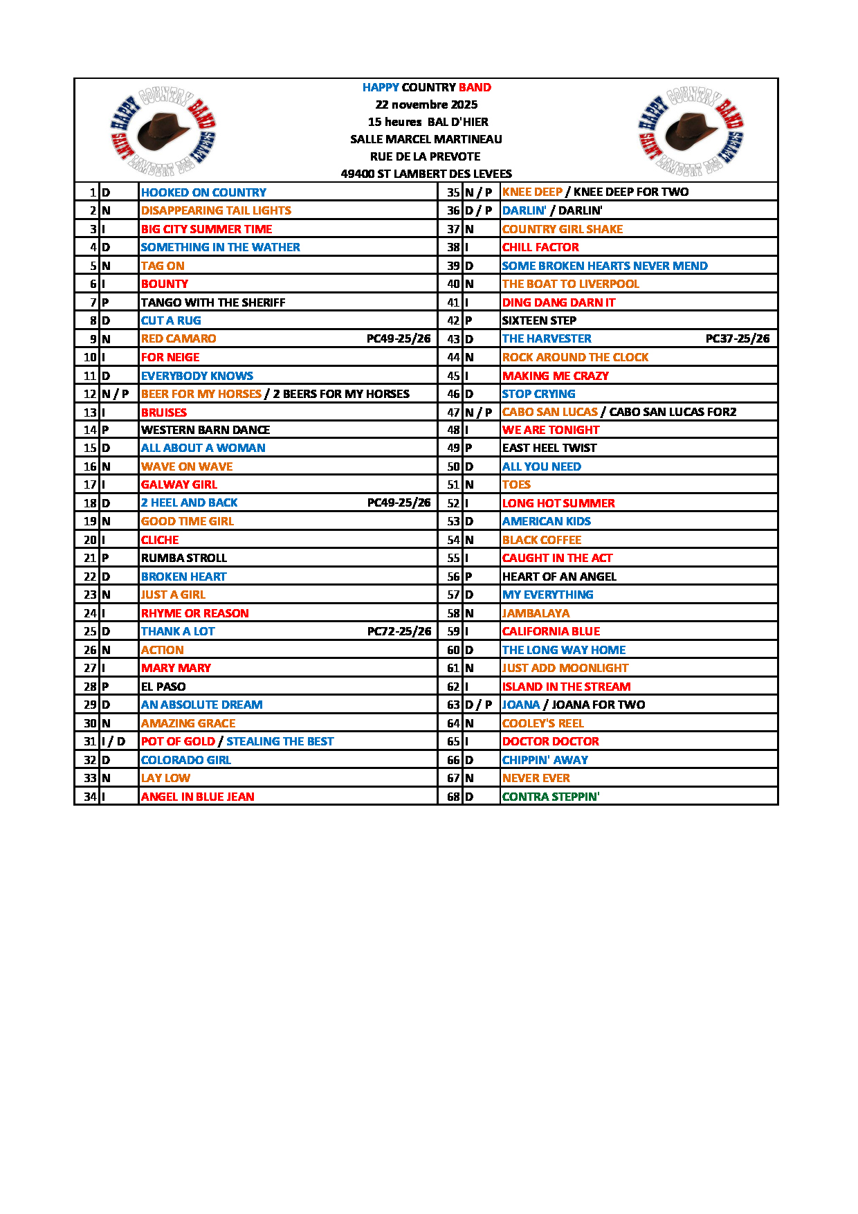 Samedi 22 à partir de 15h : Bal CD organisé par Happy Country Band à Saint Lambert des Levées (49) – Affiche – Playlist 15h – Playlist 20h –
